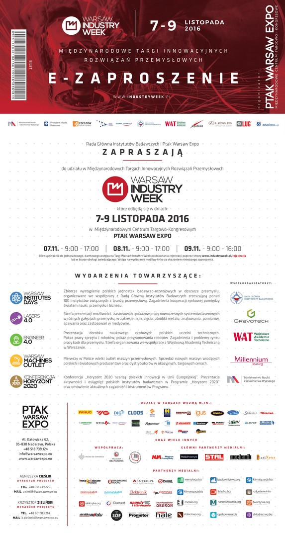 Targi Maszyn i Urządzeń Przemysłowych WARSAW INDUSTRY WEEK 2016 odbędą się w nowoczesnym Międzynarodowym Centrum Wystawienniczo Kongresowym PTAK WARSAW EXPO. Jak informują na swojej stronie internetowej organizatorzy – podczas targów zaprezentowane zostaną najnowsze rozwiązania w zakresie maszyn i urządzeń, m.in. dla branży produkcji i przetwórstwa tworzyw sztucznych i gumy, branży metalowej, branży drzewnej i meblarstwa, spawalnictwa i innych.