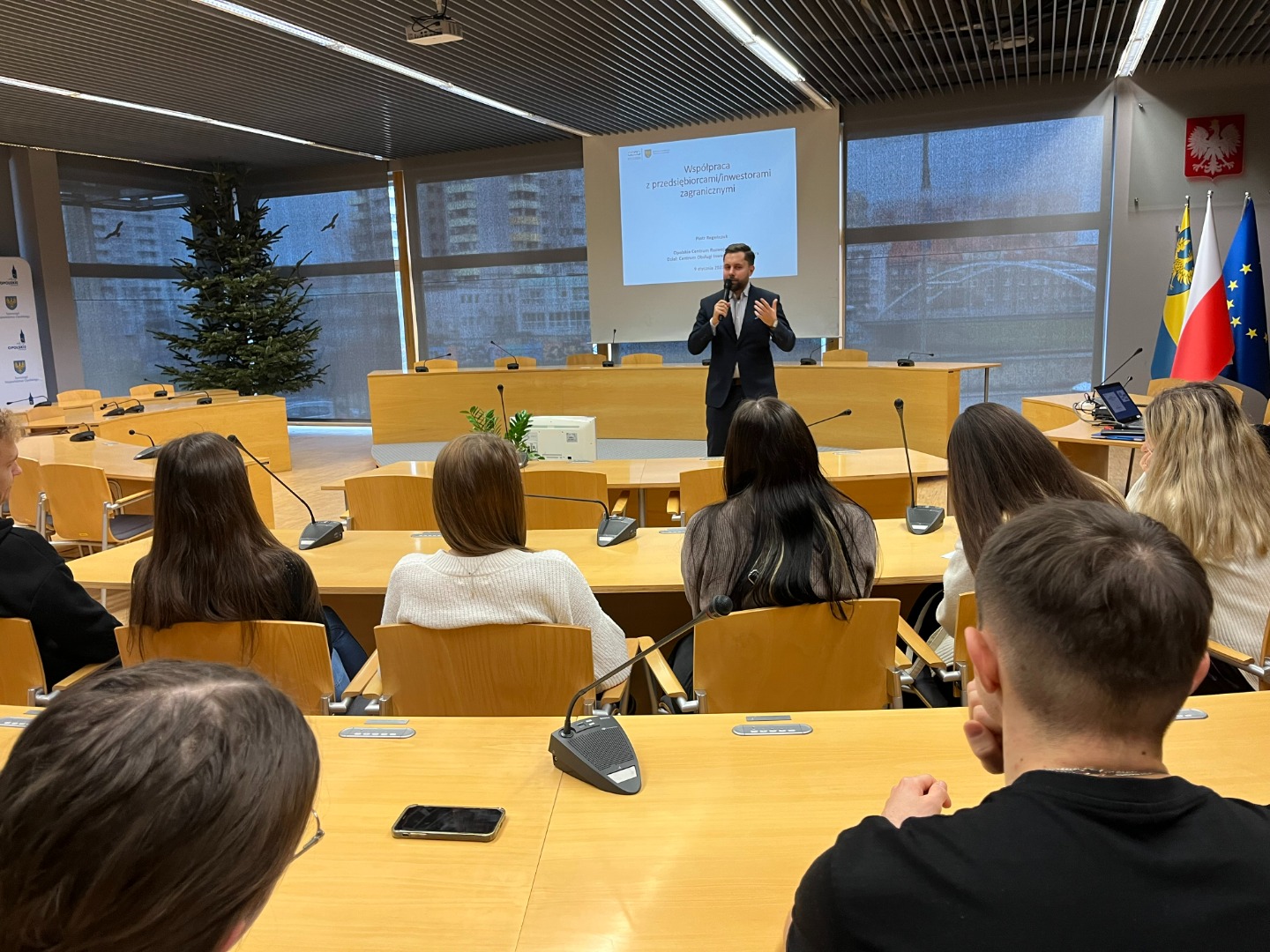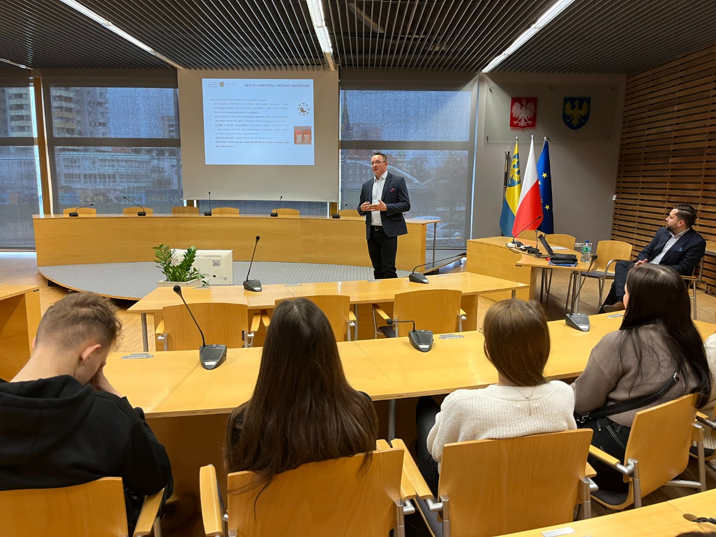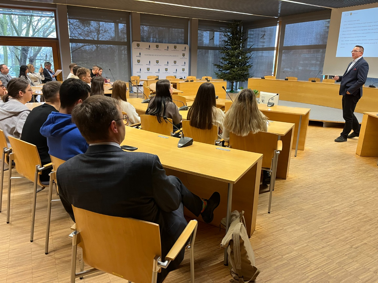 W związku z dużym zainteresowaniem wyszliśmy naprzeciw prośbom i dzisiejsze spotkanie odbyło się w Sali Orła Białego Urzędu Marszałkowskiego Województwa Opolskiego, w którym udział wzięły dwie grupy studentów: z Wydziału Ekonomii i Zarządzania Politechniki Opolska oraz Wydziału Ekonomicznego Uniwersytet Opolski.