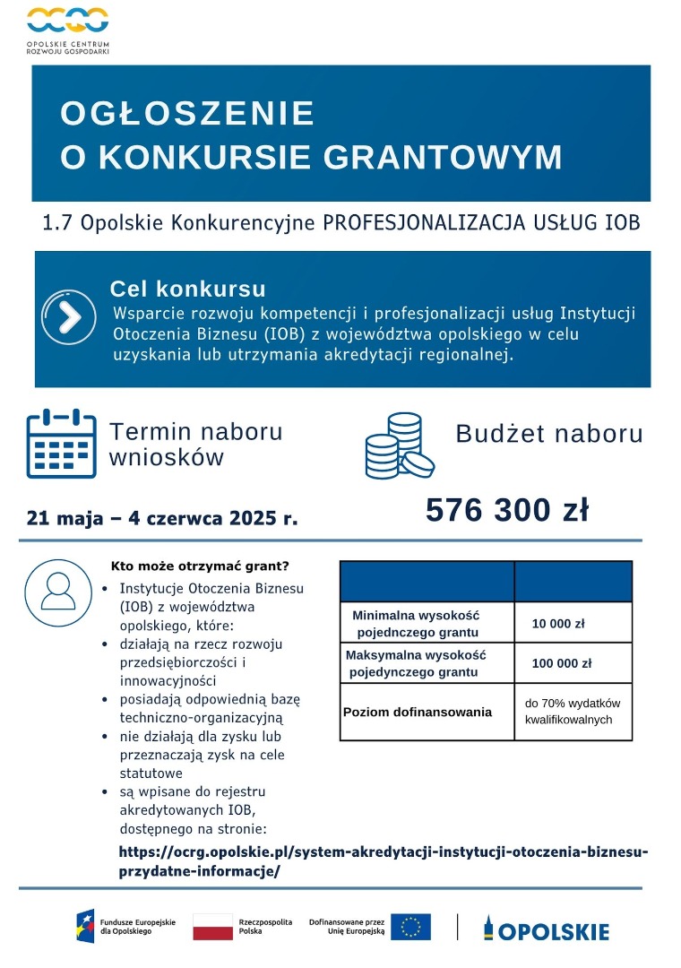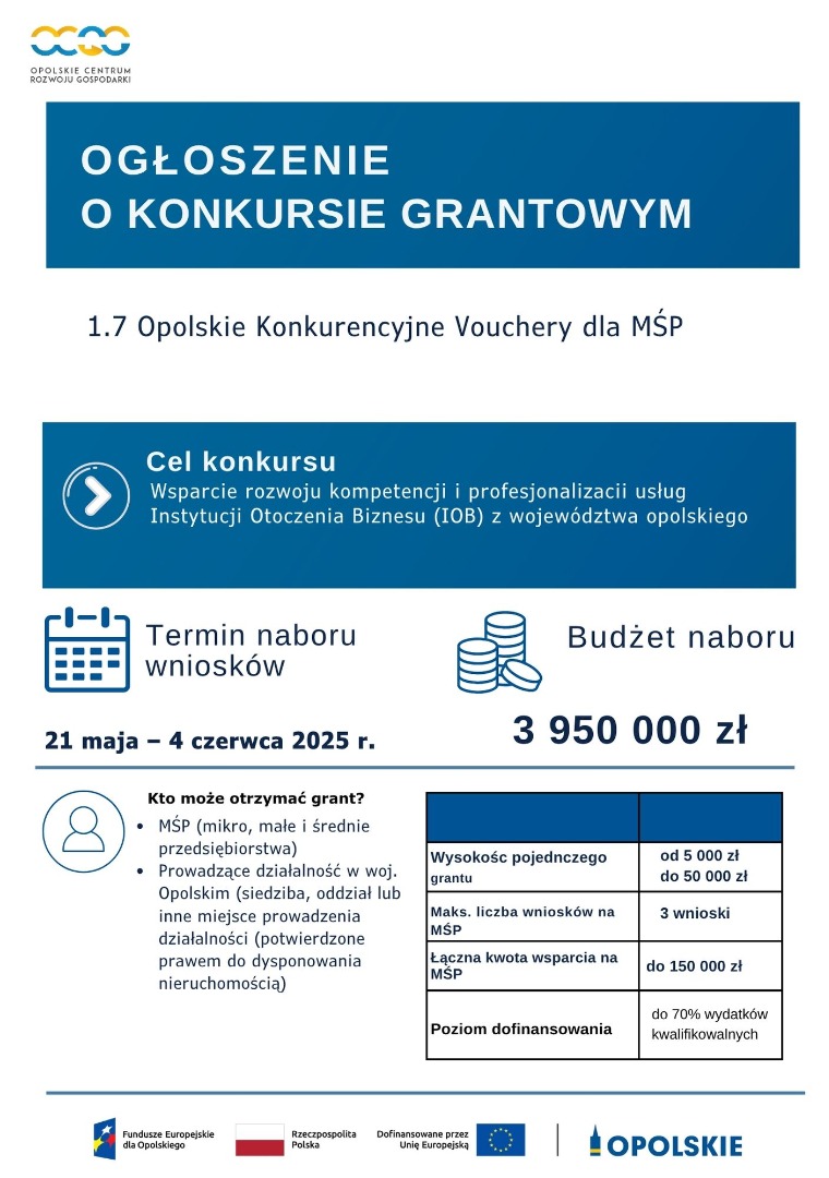 Oba konkursy są realizowane przez Opolskie Centrum Rozwoju Gospodarki w ramach projektu „1.7 Opolskie Konkurencyjne”, współfinansowanego ze środków Europejskiego Funduszu Rozwoju Regionalnego. Nabory ruszyły 21 maja 2025 r. i potrwają do 4 czerwca 2025 r. Firmy z sektora MŚP mogą ubiegać się o dofinansowanie profesjonalnych usług doradczych realizowanych przez akredytowane Instytucje Otoczenia Biznesu, którymi są Kędzierzyńsko-Kozielski Park Przemysłowy, Fundacja Rozwoju Śląska, Izba Gospodarcza Śląsk, Uniwersytet Opolski, Park Naukowo Technologiczny, Politechnika Opolska, Sieć Badawcza Łukasiewicz – Instytut Ceramiki i Materiałów budowlanych, Opolska Izba Gospodarcza, Politechnika Wrocławska. W ramach działania 1.7 Opolskie Konkurencyjne Vouchery dla MŚP, dla przedsiębiorców z Opolszczyzny niezależnie od stażu działalności, OCRG przygotowało do 150 tysięcy złotych.