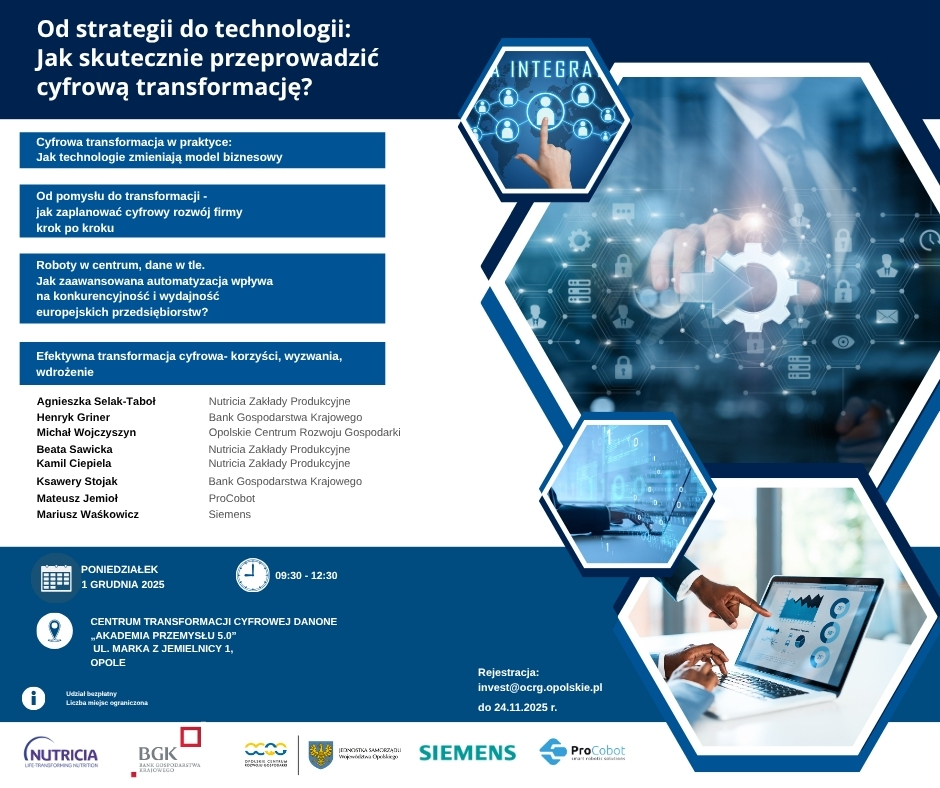 W imieniu Marszałka Województwa Opolskiego Szymona Ogłazy, Dyrektora Opolskiego Centrum Rozwoju Gospodarki Michała Wojczyszyna oraz współorganizatorów Banku Gospodarstwa Krajowego Regionu Opolskiego i Nutricii Zakładów Produkcyjnych w Opolu, zapraszamy na konferencję pn. „OD STRATEGII DO TECHNOLOGII: JAK SKUTECZNIE PRZEPROWADZIĆ CYFROWĄ TRANSFORMACJĘ ?”, która odbędzie się w dniu 1 grudnia br. w godz. 9.30 – 12.30 w budynku Centrum Transformacji Cyfrowej Danone „Akademia Przemysłu 5.0”, ul. Marka z Jemielnicy 1 w Opolu.