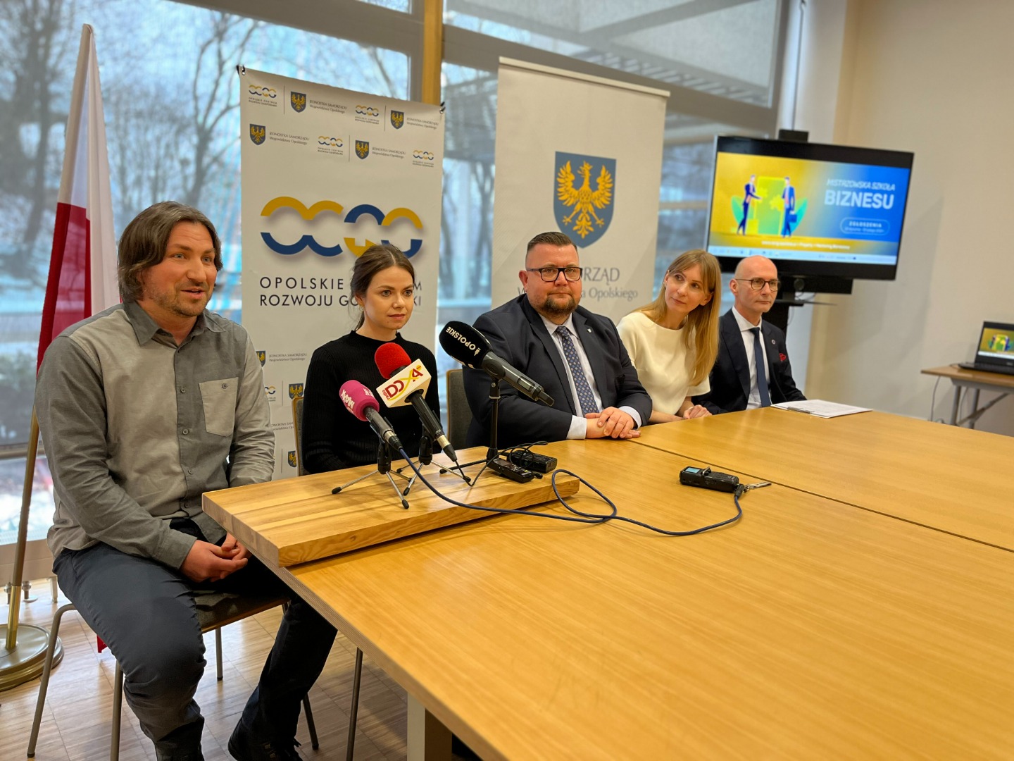 Konferencja prasowa inaugurująca VII edycję Programu Mentoringu Biznesowego odbyła się dziś w Urzędzie Marszałkowskim. Udział w niej wzięli Szymon Ogłaza, członek Zarządu Województwa Opolskiego, Tomasz Hanzel, dyrektor OCRG, Sandra Jagielska, uczestniczka minionej edycji oraz dwoje nowych mentorów:  Agnieszka Kossakowska i Adrian Kajda.